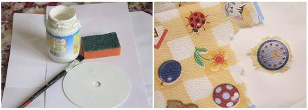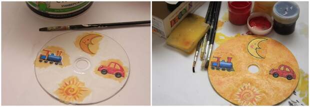 Берем цветные акриловые краски и закрашиваем фон в тон выбранным картинкам, чтобы они смотрелись единым целым.
