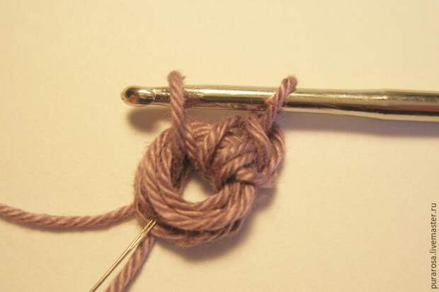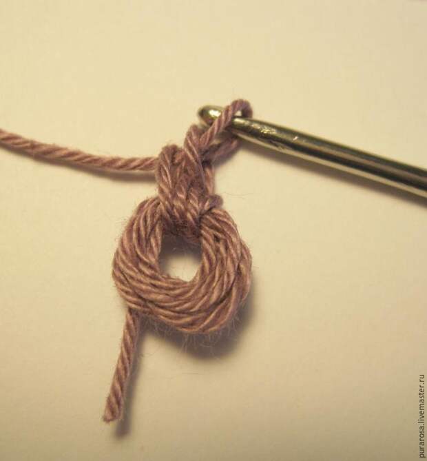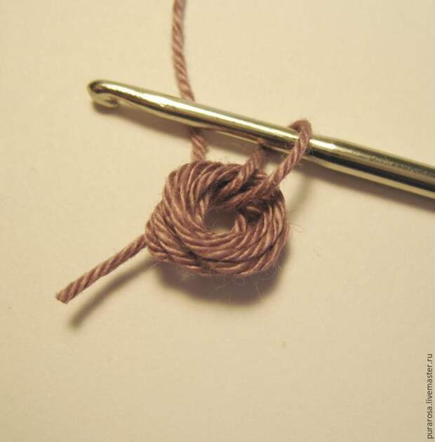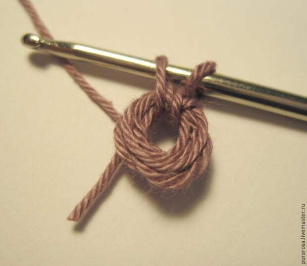 Делаем основу для пуговки. Можно намотать нить на карандаш, можно на палец, можно связать пять воздушных петель и потом соединительной петлей сделать петельку и обвязывть уже ее.